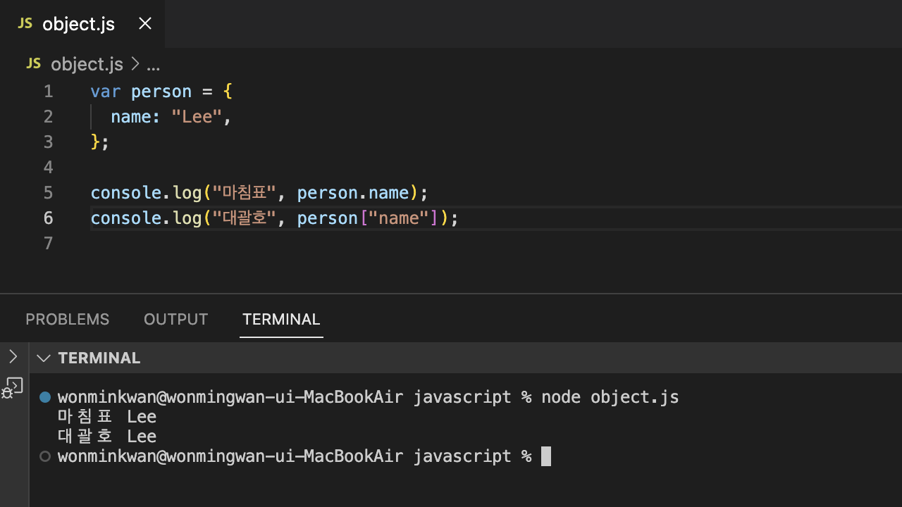 - 마침표 프로퍼티 접근 연산자(.)를 사용하는 ```마침표 표기법(dot notation)```