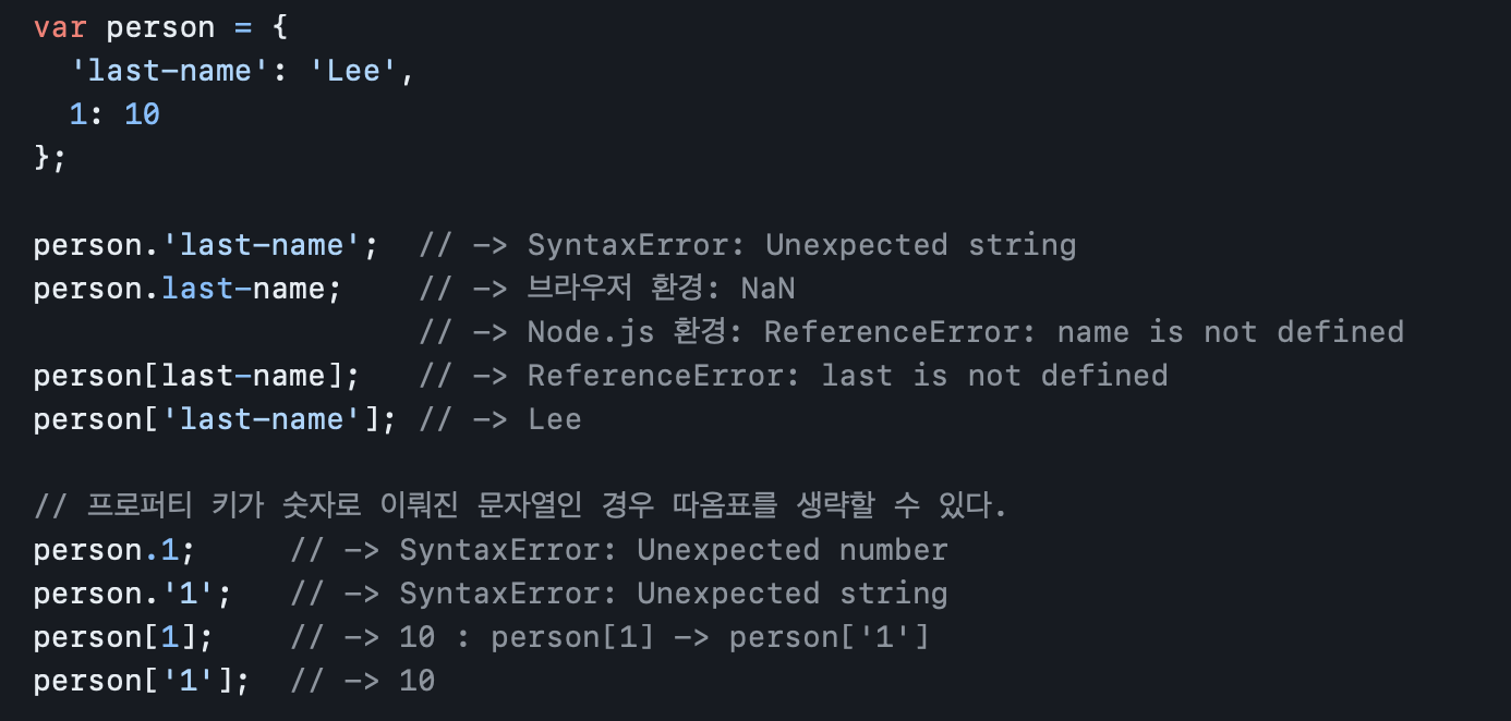 **b) 프로퍼티 키가 ```식별자 네이밍 규칙을 준수하지 않는``` 이름이면 반드시 대괄호 표기법을 사용해야 한다.**