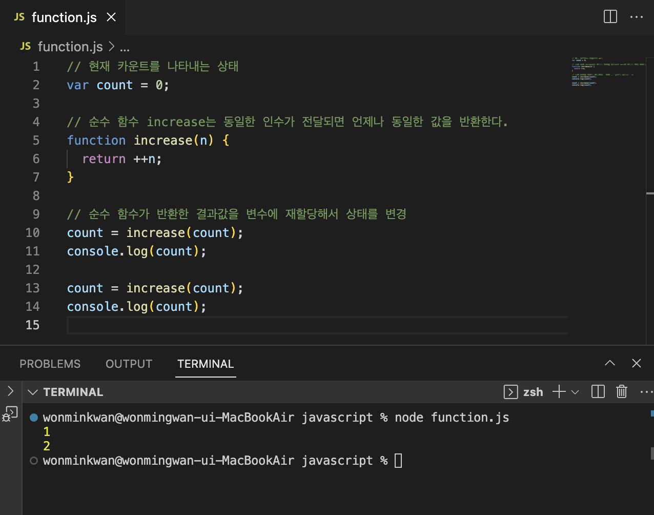 함수가 외부 상태를 변경하면 상태 변화를 추적하기 어려워진다. 따라서 함수 외부 상태의 변경을 지양하는 순수 함수를 사용하는 것이 좋다. 위 예제의 increase 함수와 같은 비순수 함수는 코드의 복잡성을 증가시킨다. 비순수 함수를 최대한 줄이는 것은 부수 효과를 최대한 억제하는 것과 같다.