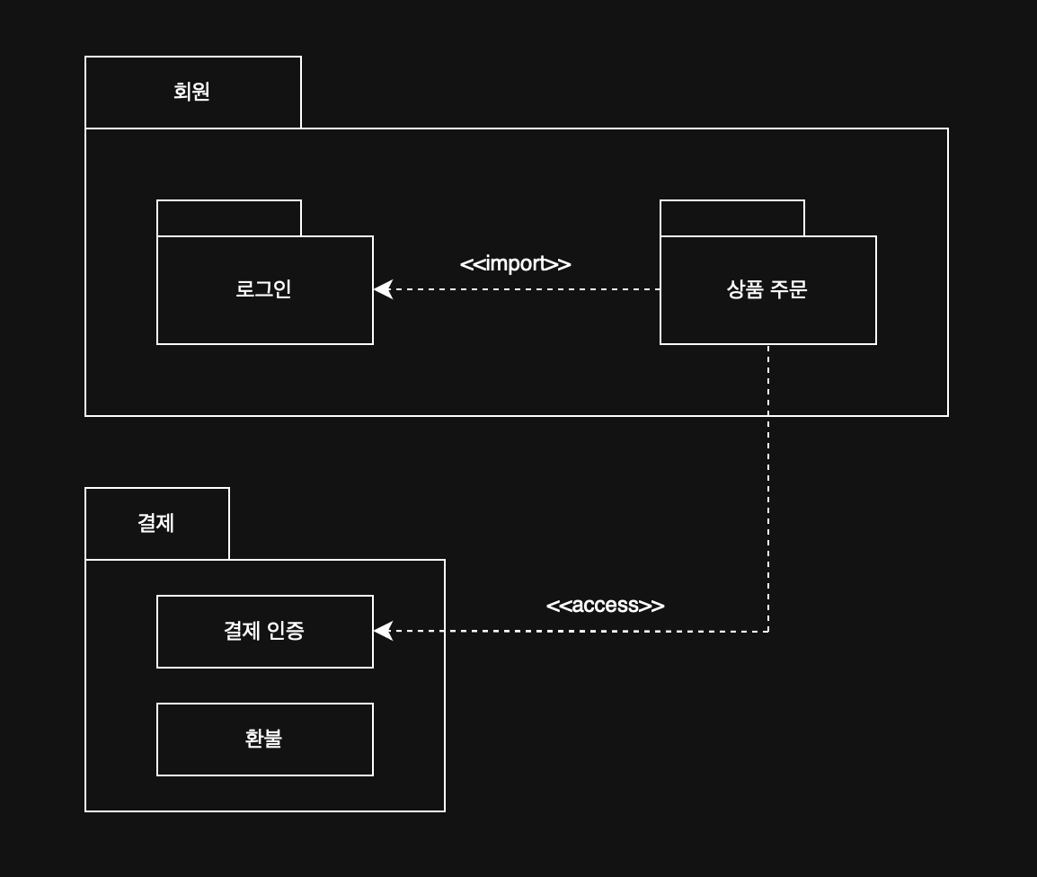 11. 패키지 다이어그램 ✅ - 유스케이스나 클래스 등의 요소들을 그룹화한 패키지 간의 의존 관계를 표현한 것