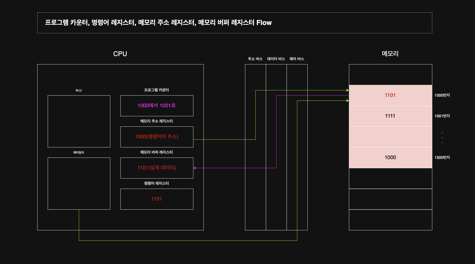 이를 위해 메모리 주소 레지스터에는 1000이 저장된다. 메모리 주소 레지스터는 ```읽어 들이고자 하는 주솟값을 주소 버스로 보낼 때 거치게 되는```레지스터인 것이다. 주소를 보내는 행위와 더불어 '메모리 읽기'를 위한 전기 신호도 보내야 할 것이다. 제어장치를 통해 메모리 읽기라는 제어신호가 메모리로 전달된다. 지금 정리한 내용이, 이미지에서 확인할 수 있는 초록색 선이다.